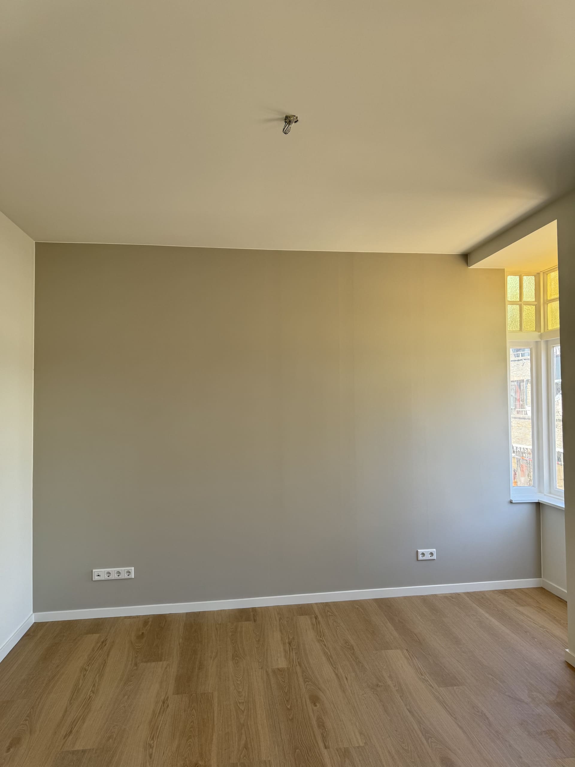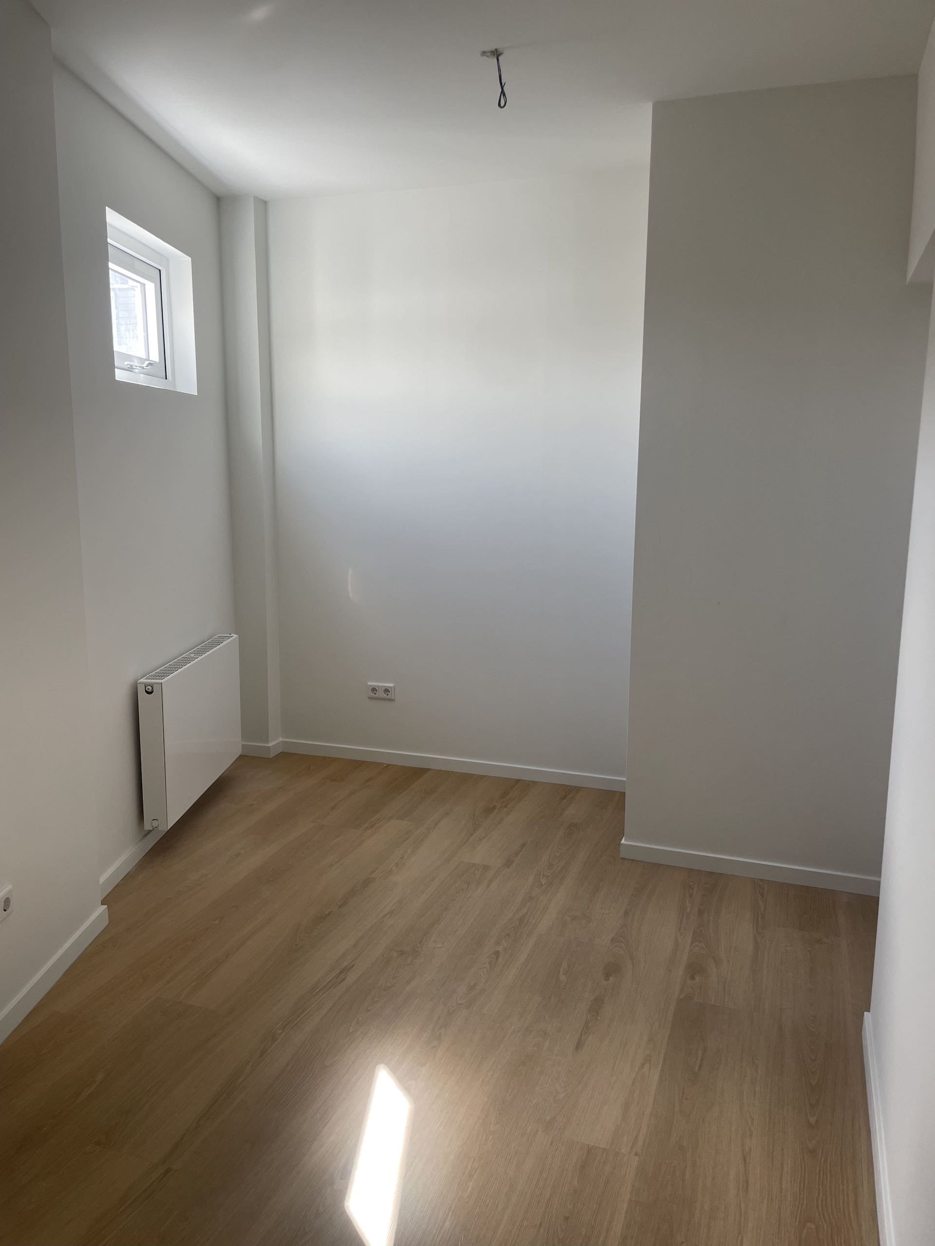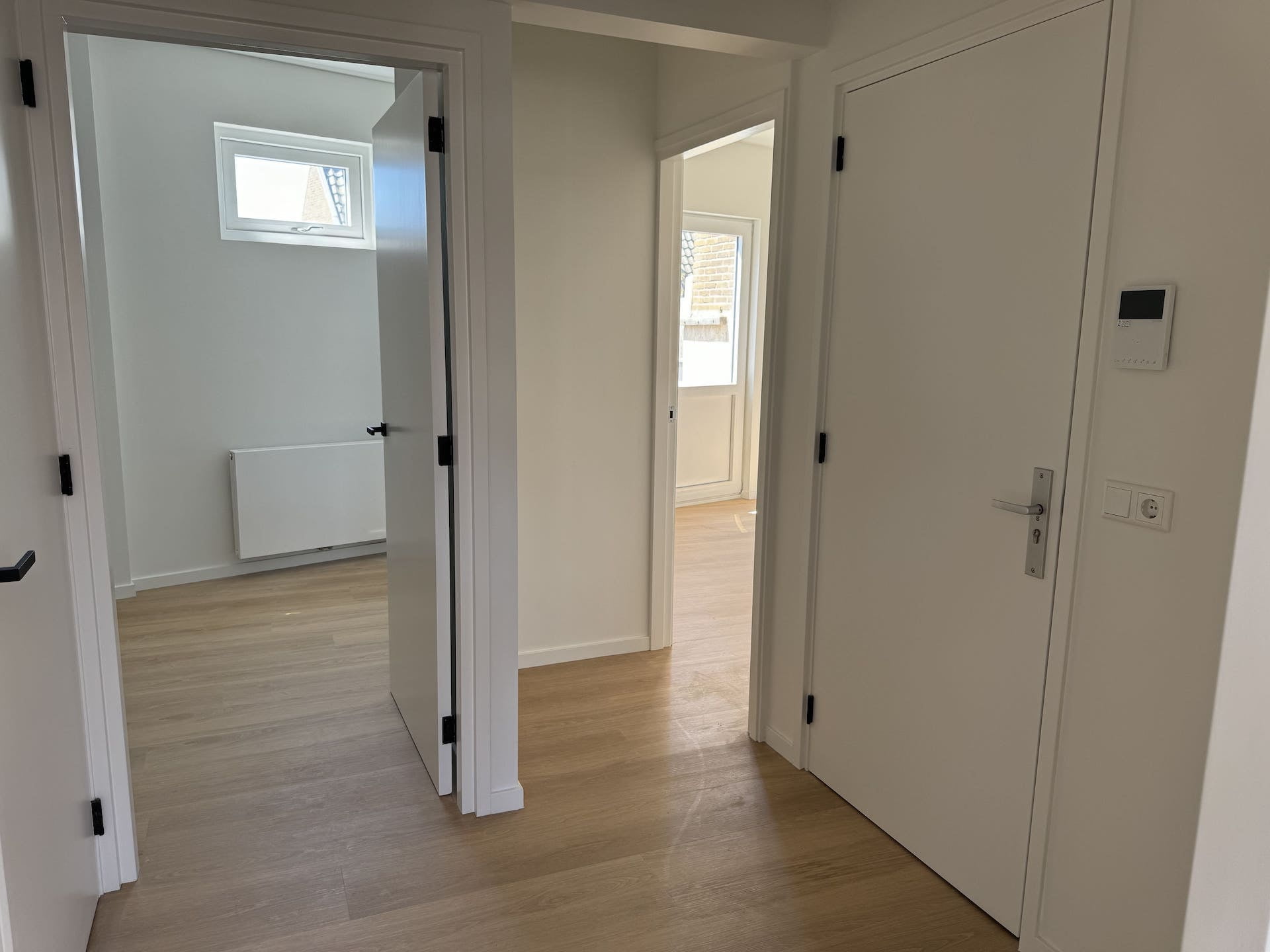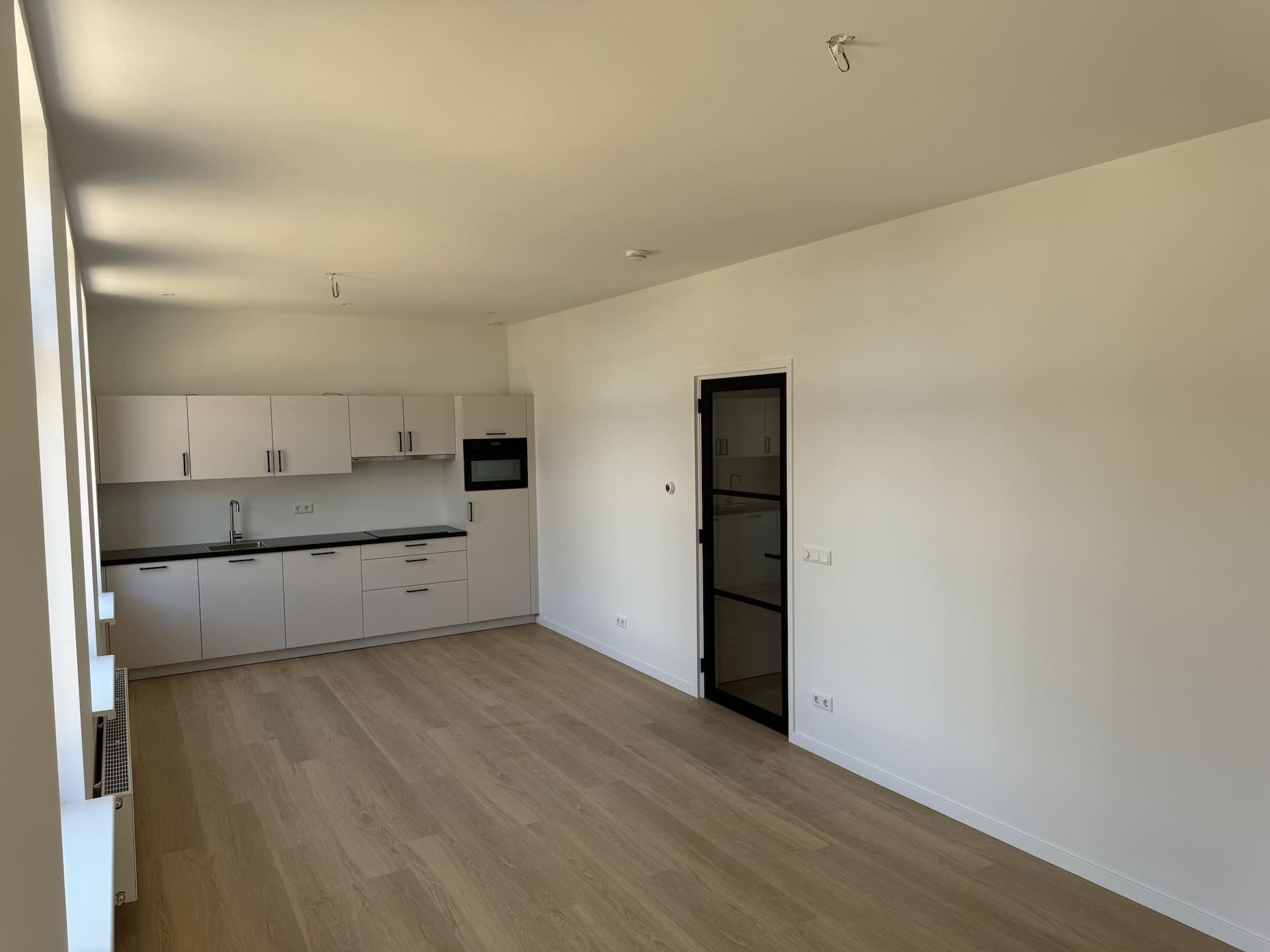 Hele appartement voorzien van een lichte pvc vloer en raamdecoratie.